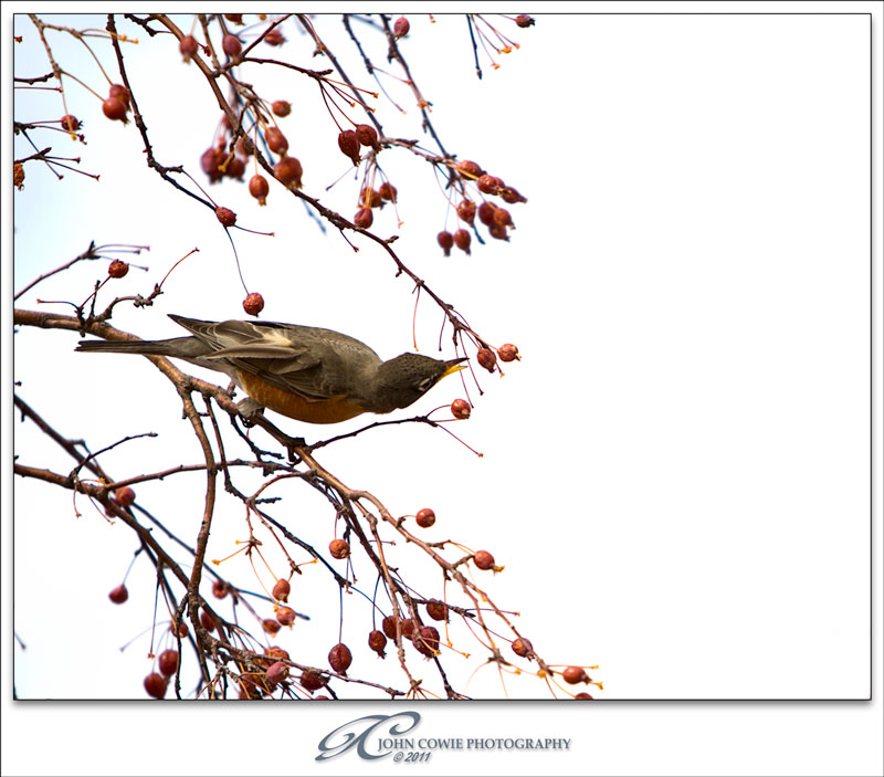 OH! While I'm thinking about it - if you're going to shoot movable objects, try shooting them actually doing something. You'll notice the conspicuous lack of berries in the 1st image, and a certain sedentary feel to the bird. After shooting him I noticed the tree with the berries had more birds, then realized they were eating the old, dried berries. In the remaining shots the birds were either in the act of choosing a berry or grabbing one. In the 2nd image, even though the bird was sitting, he still seems to be active, searching for a berry to grab. And the remaining all have energy and intent as well. It's much better to shoot that!